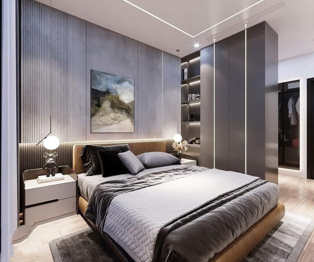 Chất liệu đá, gỗ cao cấp và các chi tiết kim loại mạ màu nhẹ nhàng được lựa chọn khéo léo, tạo nên vẻ đẹp vừa thanh lịch vừa bền vững. Phòng ngủ được thiết kế tối giản, ưu tiên sự thư giãn và riêng tư, đồng thời tận dụng tối đa ánh sáng tự nhiên từ hệ cửa kính lớn. Đây là không gian sống hoàn hảo cho những ai tìm kiếm sự tiện nghi, tinh tế và chuẩn mực của một căn hộ cao cấp.